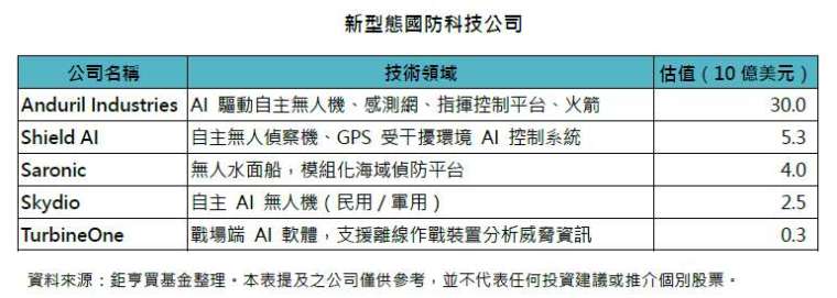 在全球國防產業中,傳統巨頭如洛克希德馬丁、雷神、波音、諾斯羅普等公司,長期主導市場,從戰機、導彈到大型防禦系統都佔有重要地位。然而,近年來戰爭型態快速演變,無人化、AI 化推動了一批新型態國防科技公司崛起。其中,Anduril 正在研發能自主飛行並協同作戰的無人機與指揮平台;Shield AI 則專注於即使在 GPS 被干擾的環境下仍能運作的偵察機;Skydio 則從民用市場延伸到軍用,成為 AI 無人機的代表。這些新創靈活又具創新能力,吸引了大量資金與高度評價,被視為未來國防科技的重要角色。