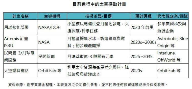 許多人仍以為上太空是遙不可及的夢想,但事實上,為了因應 AI 發展所帶來的算力與電力需求,全球已經積極展開太空探勘計畫。這些計畫不僅是科學研究,更逐步走向商業化,背後有眾多企業投入其中。例如,美國 NASA 與能源部正推動「月球核能部署」計畫,目標是在 2030 年啟用小型核反應爐,為登月基地供電;阿特米斯計畫則鎖定月球資源的利用,Astrobotic 與 Blue Origin 等公司都已經參與鑽探與採礦測試;民間新創如 Interlune 與 OffWorld 則聚焦於稀有金屬的月壤開採;此外,Orbit Fab 也在布局太空燃料循環,希望能為衛星補充燃料並降低維護成本。